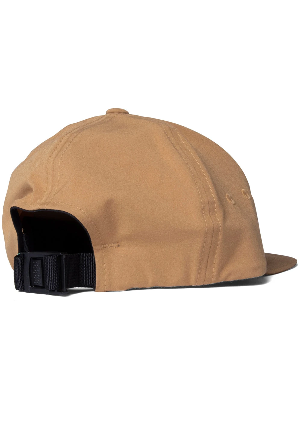 Keep the sun at bay with the Lay Day Eco hat, an unstructured, ultra-light 5 panel hat with a packable floatable bill and adjustable nylon strap closure. This hat is fashioned with upcycled coconut and polyester Repreve boardshort fabric, a woven patch custom interior taping and flag label at back.