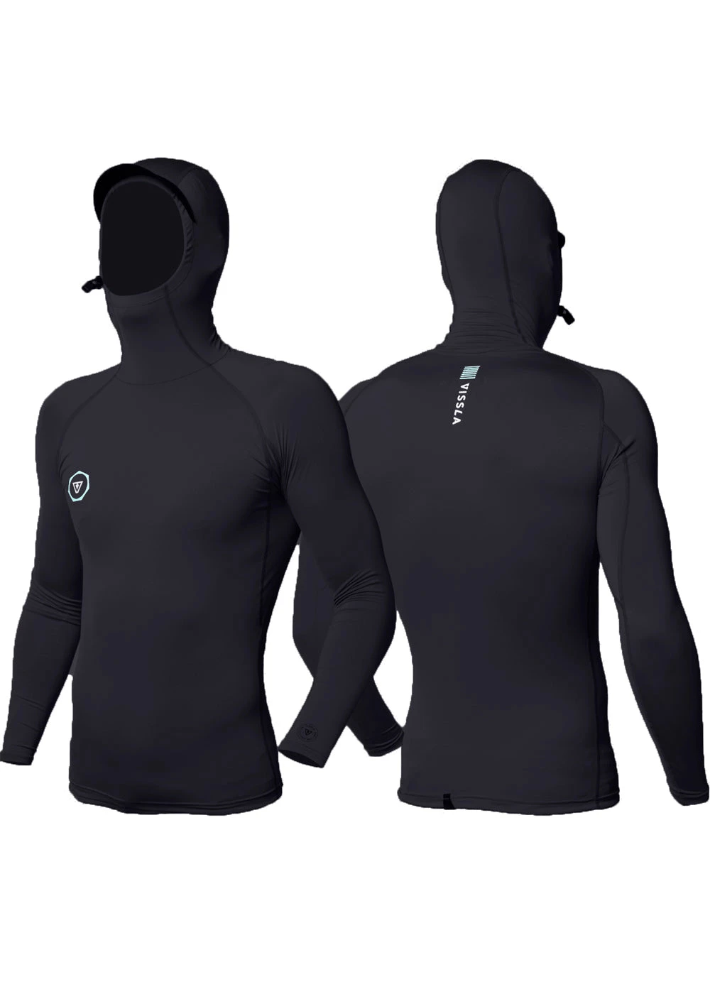 Snug fit hooded long sleeve with maximum UPF protection. 5oz soft cool fabric with screen print logo at front chest. Features elastic loop at front bottom hem. Quick dry & Antimicrobial.